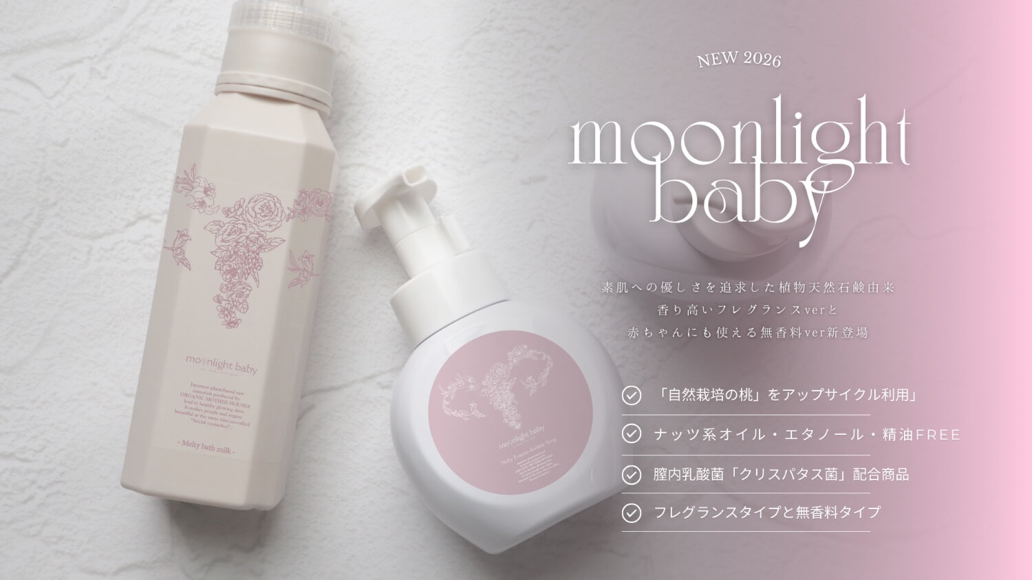 山梨県産の自然栽培「桃果実・葉・花」をアップサイクルして生まれたフェムケア&ベビーケア&マタニティケア「moonlight baby」から初の美容入浴料&泡ソープが誕生しました。12月末まで最大30%OFF!