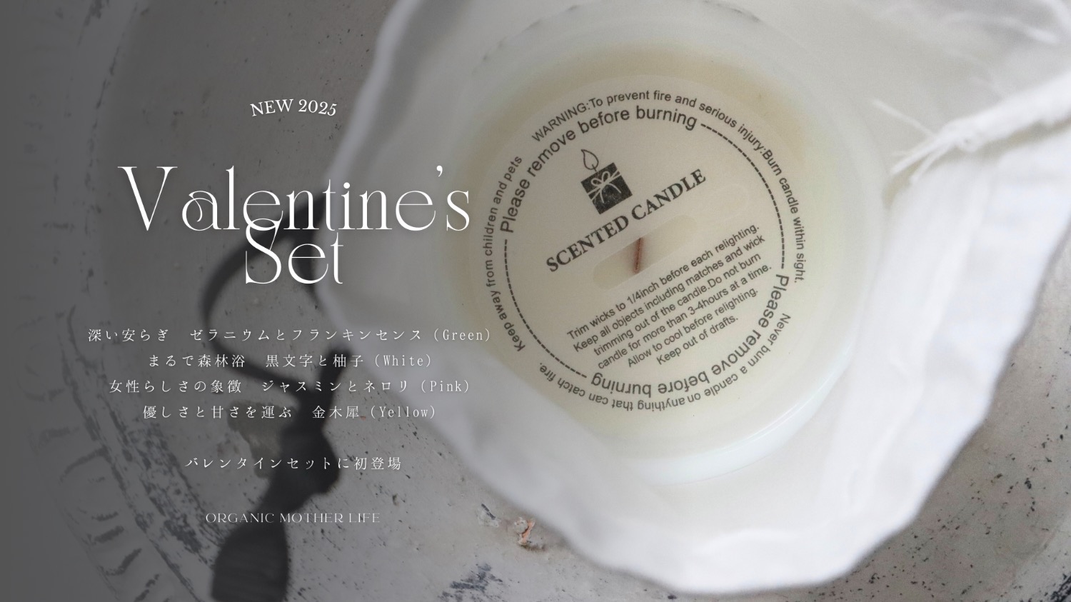 OML初の大豆オイルのアロマキャンドルは、香りはすべて”天然精油”や”植物香料”だけ。4種の香りから選ぶことができ、今の期間だけネットで購入が可能です。20%OFFで買えるバレンタインセットが新登場!