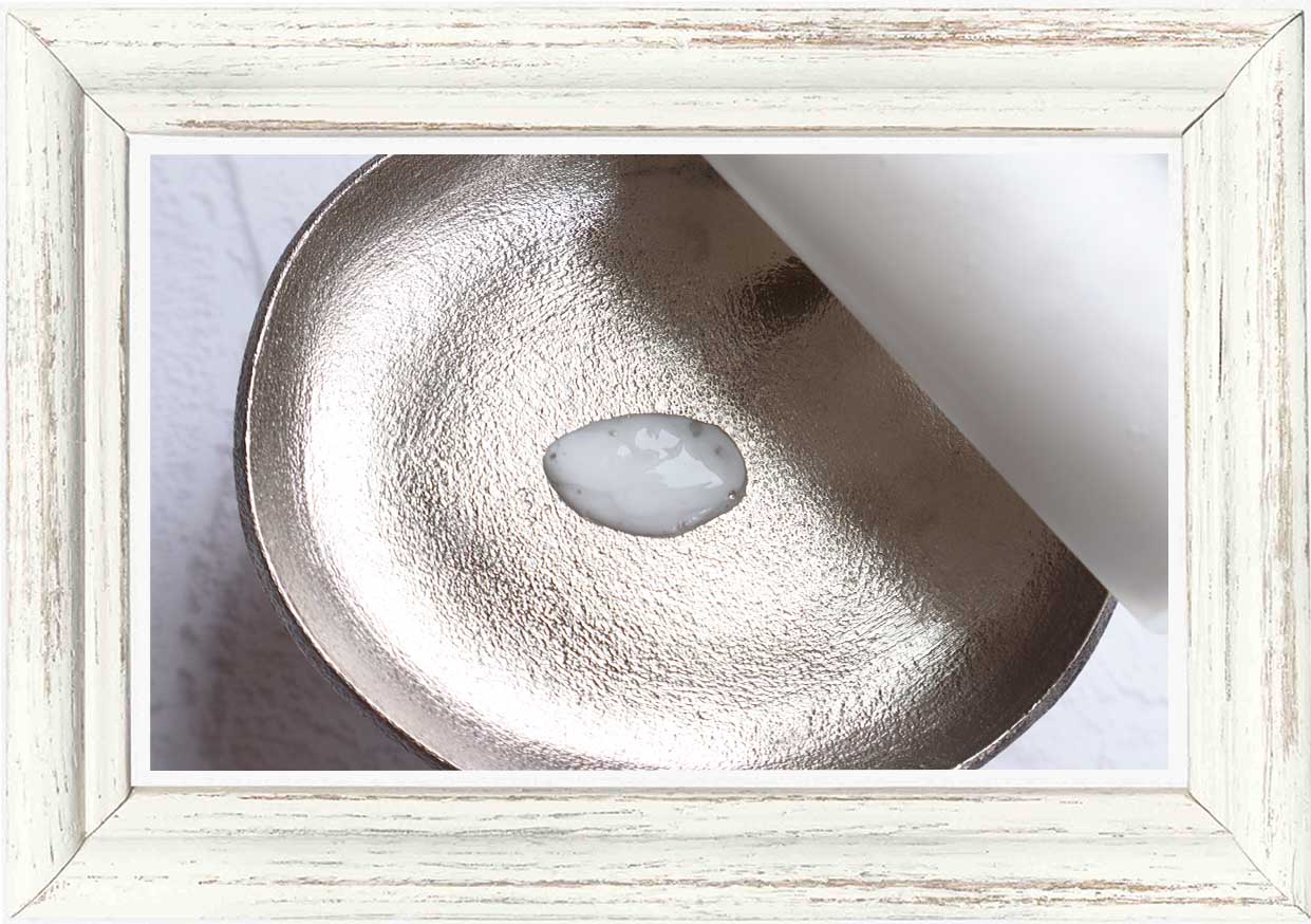 3. 続いてパトラセラムを1プッシュ手に取り、水分を「多糖質成分(クインスシードエキスなど)」で包み込むように浸透(角質層まで)させます。